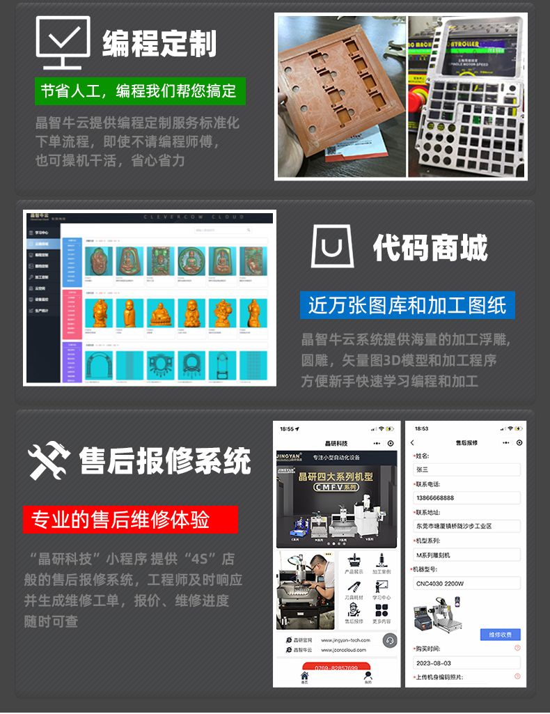 晶研M系列桌面雕刻機(jī)提供多種功率選擇,適應(yīng)不同硬度材料加工需求。其高精度編碼限位系統(tǒng)、高速閉環(huán)電機(jī)和智能驅(qū)動(dòng)卡,確保了加工的精度、速度和節(jié)能效果。此外,晶智牛云系統(tǒng)和手機(jī)小程序?yàn)橛脩籼峁┝吮憬莸慕虒W(xué)和售后服務(wù),使其成為工業(yè)應(yīng)用的理想選擇。