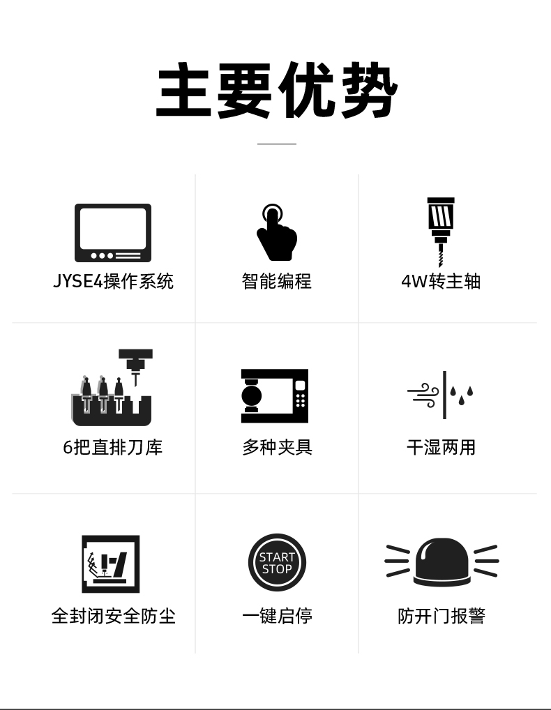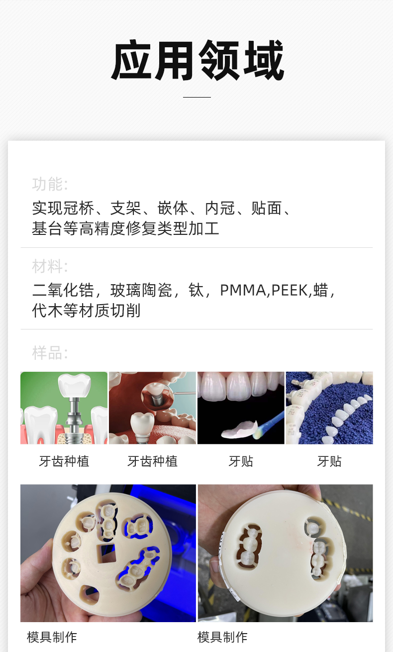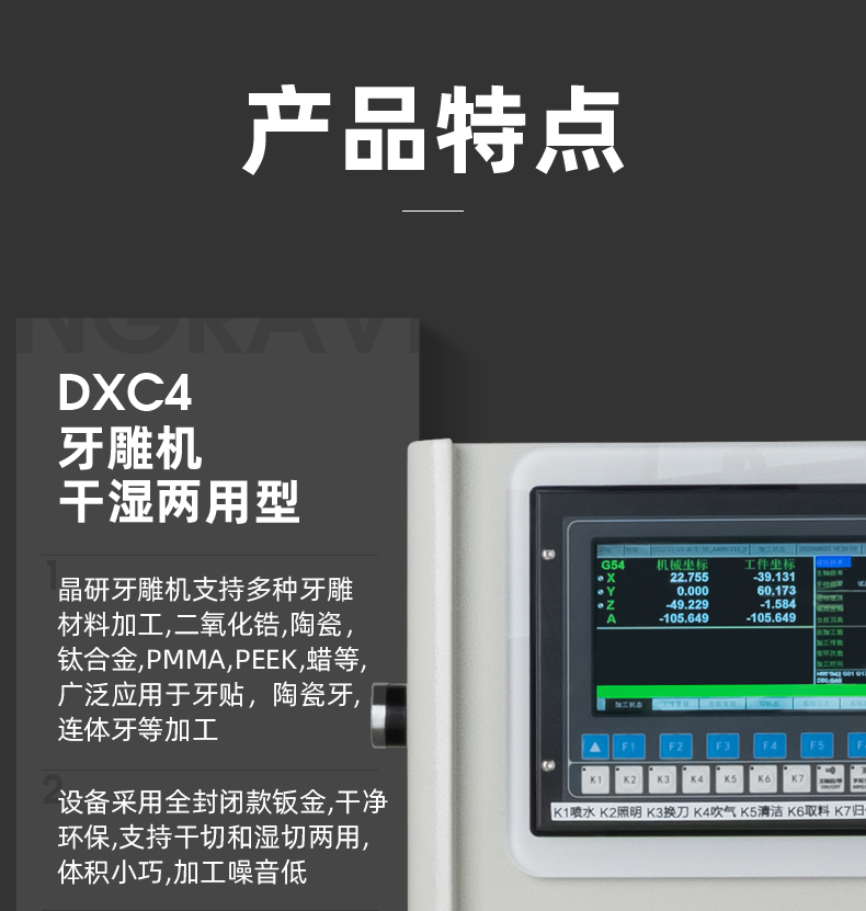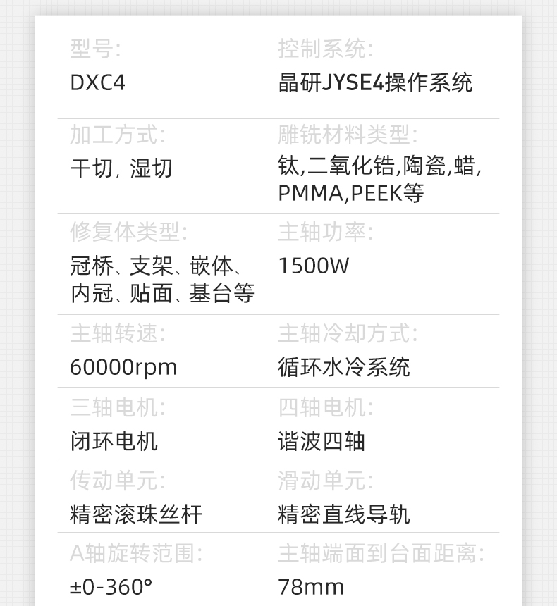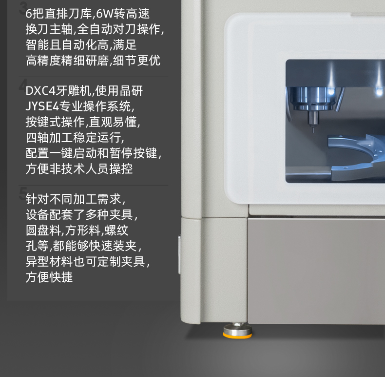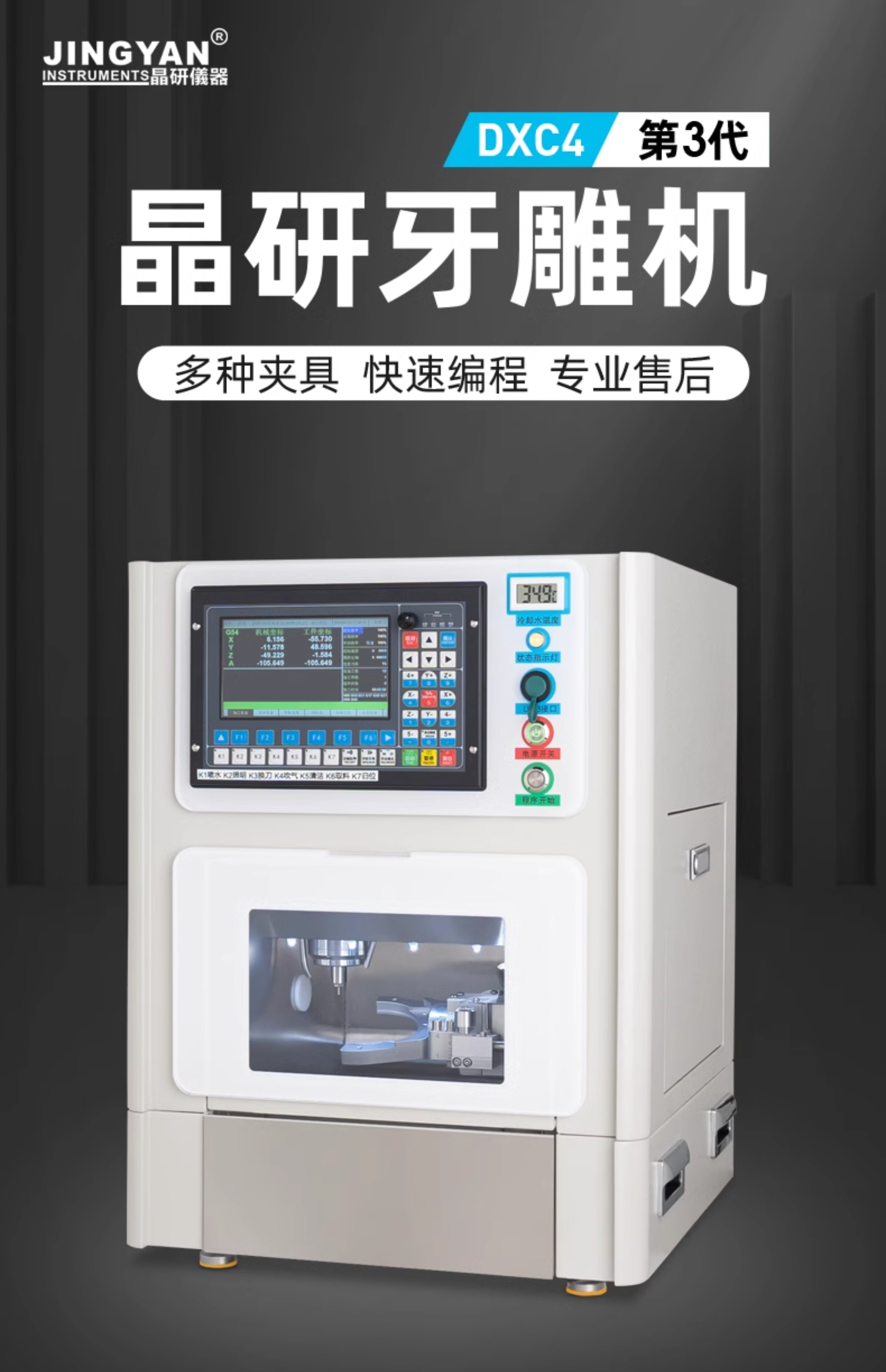 晶研DXC4牙雕機(jī),干濕兩用,支持二氧化鋯、陶瓷、鈦合金、PMMA、PEEK、蠟等多種材料加工,適用于牙貼、陶瓷牙、連體牙等。全封閉鈑金設(shè)計(jì),干凈環(huán)保,干濕切皆可,體積小巧,噪音低。6把直排刀庫,6萬轉(zhuǎn)高速主軸,全自動(dòng)對(duì)刀,高精度研磨細(xì)節(jié)佳。配備JYSE4系統(tǒng),按鍵操作簡(jiǎn)單,四軸加工穩(wěn)定,一鍵啟動(dòng)暫停,易上手。多種夾具適配,異型材料可定制,裝夾便捷。