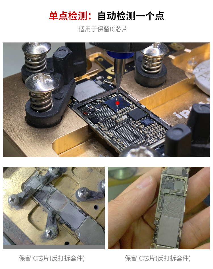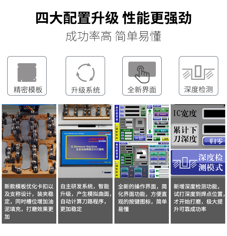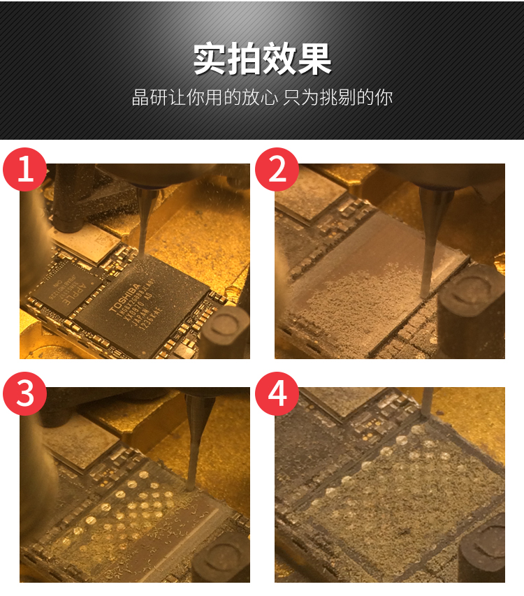 晶研智能BGA芯片拆除機(jī)是由東莞市晶研儀器科技有限公司獨(dú)立研發(fā)的全自動(dòng)BGA芯片維修平臺(tái),配合相應(yīng)高精度定制模具可對(duì)各種類型的IC芯片進(jìn)行拆除或者打磨,效果優(yōu)秀。晶研智能BGA芯片拆除機(jī)采用進(jìn)口耗材,整機(jī)的裝配都經(jīng)過(guò)嚴(yán)格的把關(guān)。拆除機(jī)以其獨(dú)有的平面度檢測(cè)功能使得打磨變形的BGA主板更加精確簡(jiǎn)單。