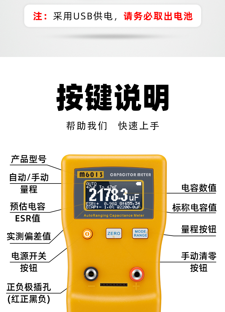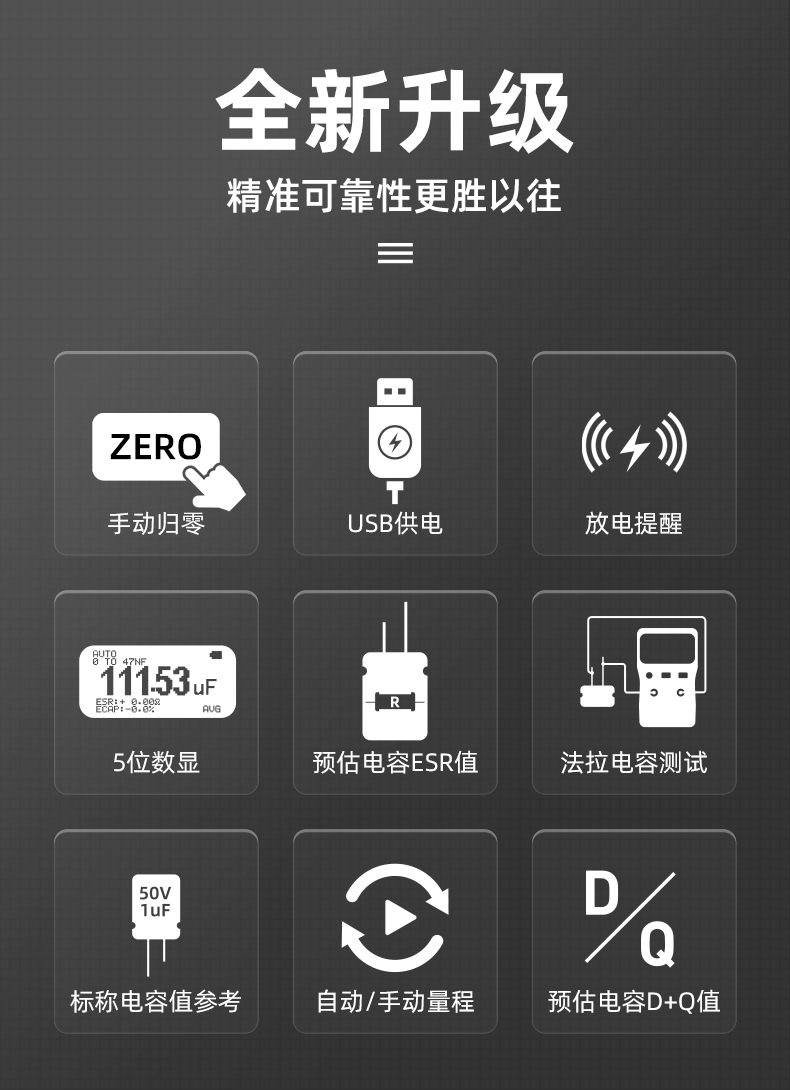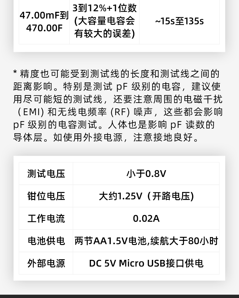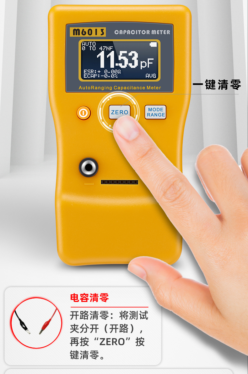 高精度1%,自動量程,超寬量程測試,AVG滑動平均功能,讀取數(shù)值更加精準,一鍵清零按鈕,方便更加穩(wěn)定,減少誤差,自動關(guān)機功能,節(jié)省電量。