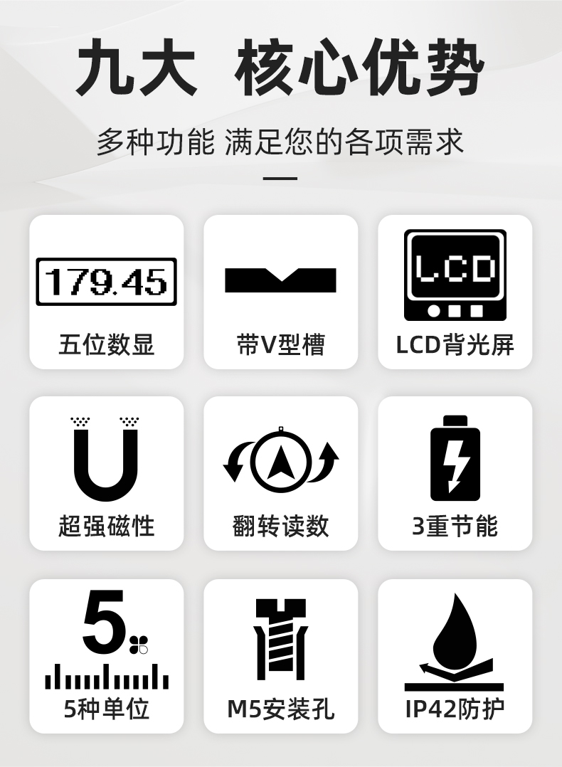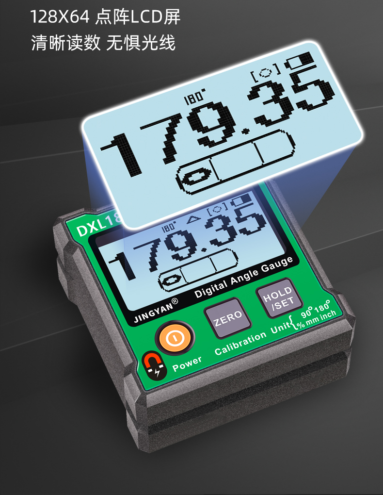 DXL180/C是一款可以使用多種單位顯示的數(shù)字角度儀,支持單位為角度、斜率、英寸和毫米/米的讀數(shù)。測(cè)量范圍為2*0-180°和4*0-90°,儀器底部測(cè)量面具有強(qiáng)力磁性。V形凹槽設(shè)計(jì)便于放置在圓形管上進(jìn)行測(cè)量。支持IP42等級(jí)防塵防水,背面預(yù)留M4螺絲孔,方便安裝固定。DXL180/C廣泛應(yīng)用于木工切割、機(jī)械制造、裝修設(shè)計(jì)、攝影愛(ài)好、產(chǎn)品檢測(cè)等領(lǐng)域。