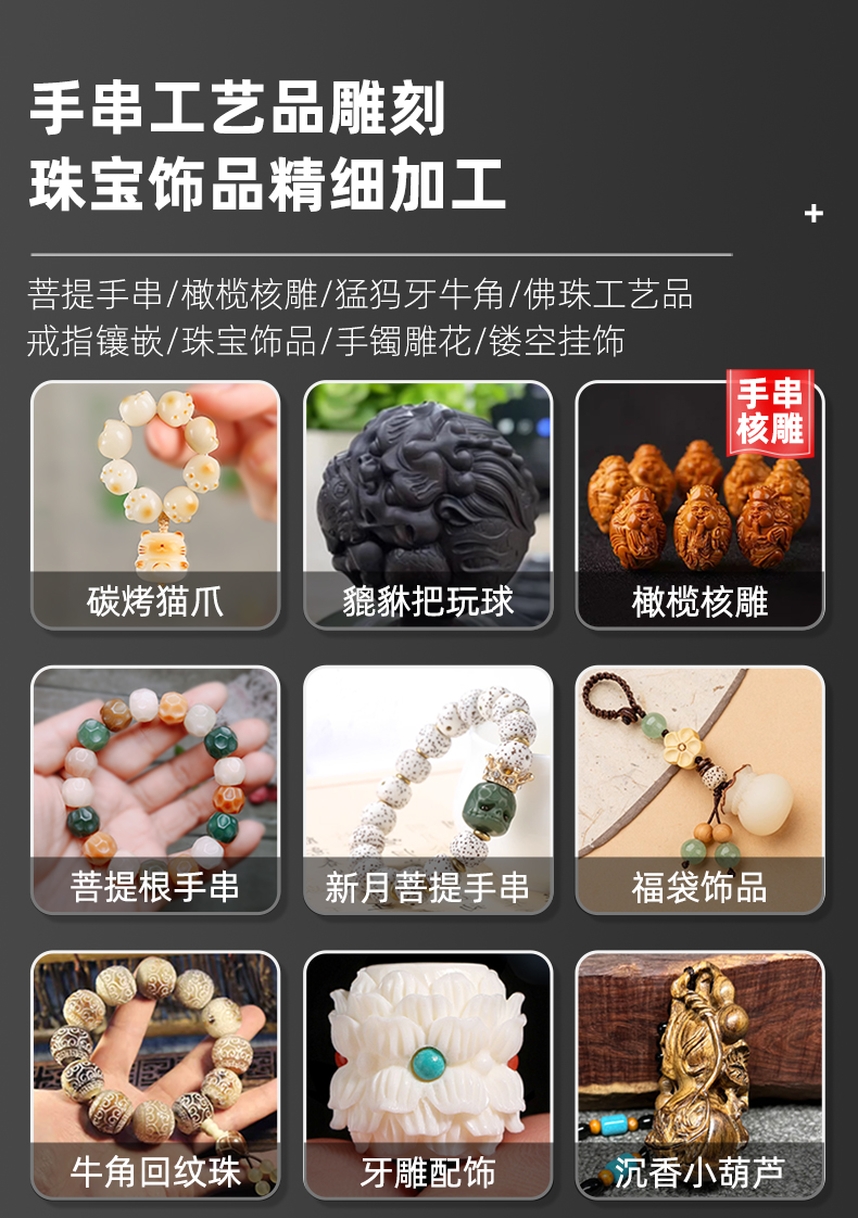 晶研儀器C1010第三代迷你款·菩提核雕機(jī),專為手串工藝品和珠寶飾品設(shè)計(jì)。該設(shè)備具備兩種系統(tǒng)選擇:MACH 3 電控系統(tǒng)和JYS4脫機(jī)電控系統(tǒng),滿足不同加工需求。其九大核心特性包括專業(yè)系統(tǒng)、四軸聯(lián)動(dòng)、高速加工等,確保加工效率和精度。四大性能升級(jí),如智能計(jì)件、快速上料、高速運(yùn)行和節(jié)能省電,進(jìn)一步提升操作便捷性和經(jīng)濟(jì)效益。設(shè)備適用于多種材料加工,如菩提手串、橄欖核雕等,是個(gè)性化定制和批量生產(chǎn)的理想選擇。