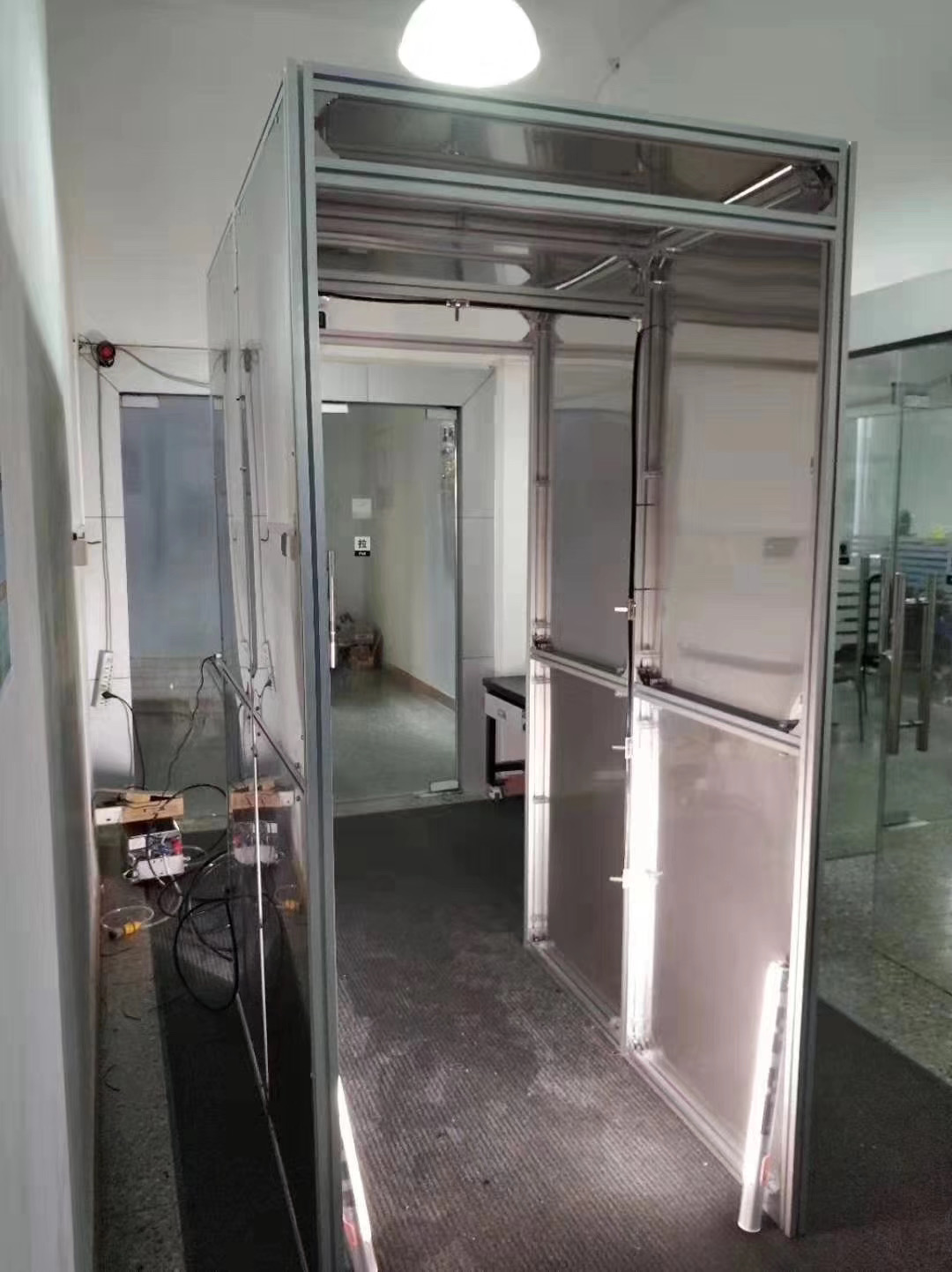 自動消毒通道內(nèi)置7個可調(diào)角度霧化噴頭,可全方位,多角度,無死角全身消毒,水珠能到直徑10um,有效覆蓋衣服和人體肌膚上古,噴灑時間能調(diào)節(jié)1到20秒,一般預設時間是3秒,之后便定時停止。